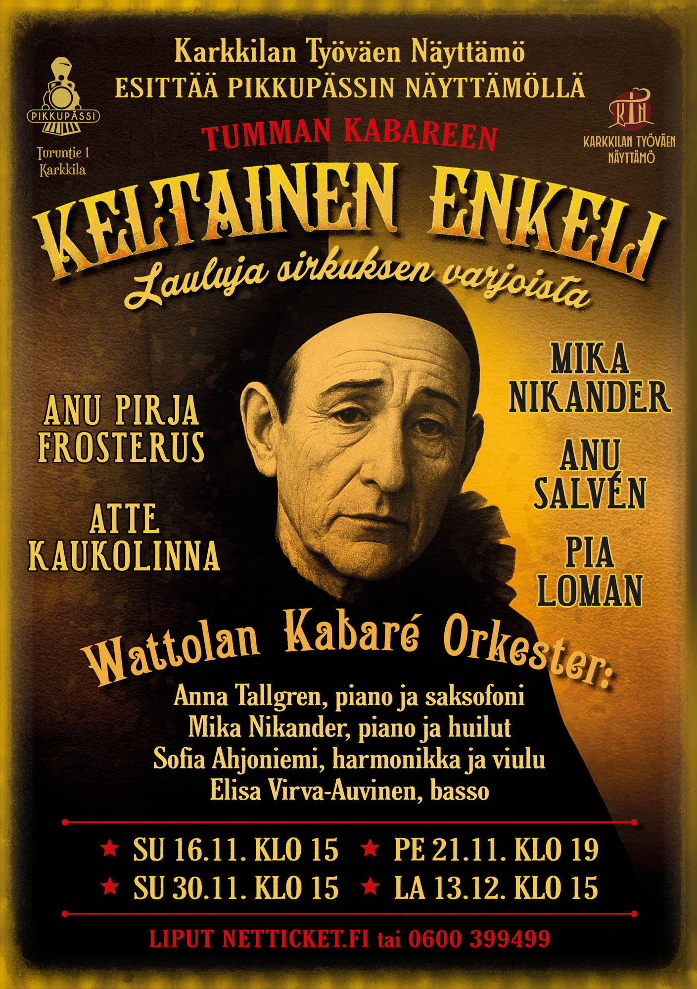 Esiintyjän elämä on usein kaksijakoinen. Valot, aplodit ja yleisön ihailu kätkevät alleen toisen todellisuuden – varjot, jotka kulkevat mukana kulissien takana. Näihin varjoihin johdattaa Karkkilan Työväen Näyttämön uusi tuotanto Keltainen enkeli, joka saa ensi-iltansa Pikkupässin näyttämöllä. Kyse ei ole pelkästään kepeästä ilottelusta, vaan tummasta kabareesta, jossa laulu ja musiikki paljastavat taiteilijan elämän haurauden. Kabareelaulut kuljettavat katsojaa yksinäisyyden, kaipuun ja toivon rajamaille, missä esiintyjä on kaikkein inhimillisin. Lavalla nähdään taitavat tulkitsijat Anu Pirja Frosterus, Atte Kaukolinna, Mika Nikander, Anu Salvén ja Pia Loman. Musiikista vastaa elävä Wattolan Kabaré Orkesteri, jonka riveissä soittavat Anna Tallgren (piano ja saksofoni), Mika Nikander (piano ja huilut), Sofia Ahjoniemi (harmonikka ja viulu) sekä Elisa Virva-Auvinen (basso). Esityksen suunnittelu ja ohjaus: Mika Nikander