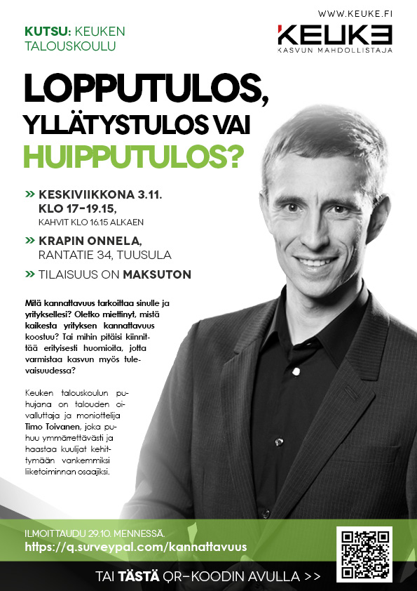 Keuken talouskoulun puhujana on talouden oivalluttaja ja moniottelija Timo Toivanen, joka puhuu ymmärrettävästi ja haastaa kuulijat kehittymään vankemmiksi liiketoiminnan osaajiksi.