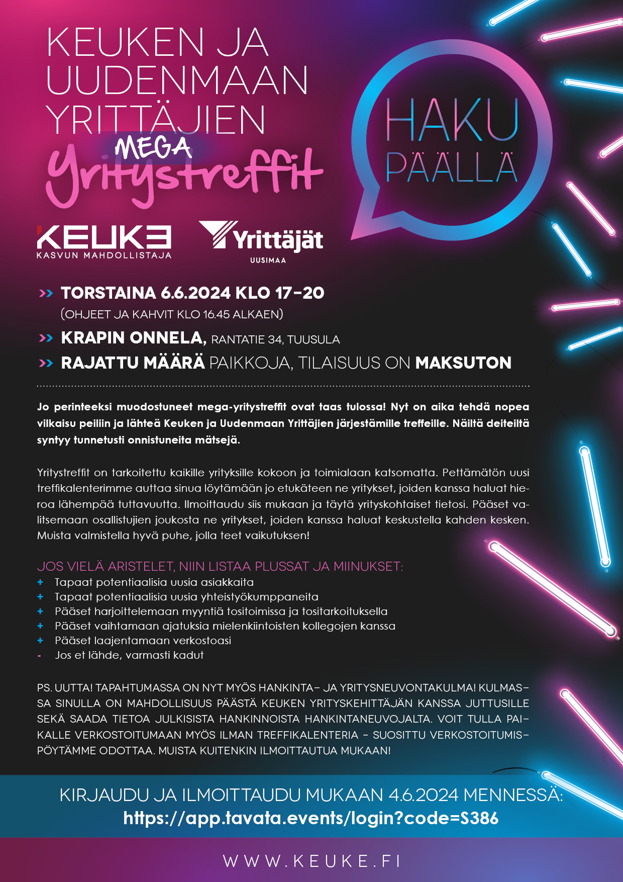 Ps. Uutta! Tapahtumassa on nyt myös hankinta- ja yritysneuvontakulma! Kulmassa sinulla on mahdollisuus päästä Keuken yrityskehittäjän kanssa juttusille sekä saada tietoa julkisista hankinnoista hankintaneuvojalta. Voit tulla paikalle verkostoitumaan myös ilman treffikalenteria – suosittu verkostoitumispöytämme odottaa. Muista kuitenkin ilmoittautua mukaan!