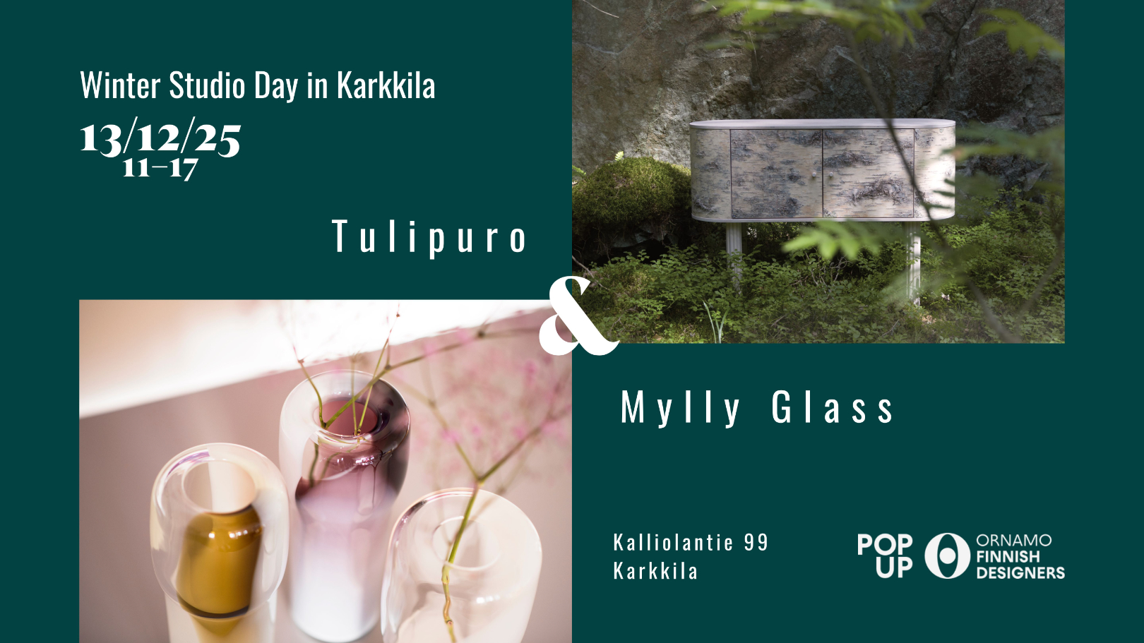 Tulipuro & Mylly Glass järjestävät talvisen studiopäivän Karkkilassa lauantaina 13.12.2025 klo 11–17. Tapahtumassa palkittu muotoilija Tobias Feuerbacher esittelee uutuuksia Birch Forest- ja Lato-mallistoista, ja Mylly Glass tuo esille uniikkia suomalaista lasitaidetta Virta-mallistosta. Päivän aikana kävijät voivat osallistua myös lyhyisiin työpajoihin, joissa valmistetaan oma pieni tuohirasia