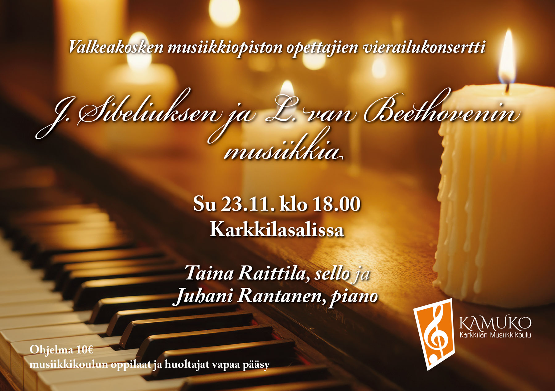Tervetuloa konserttiin Karkkilasaliin (Anttilankatu 2-4) sunnuntaina 23.11. klo 18.00 kuulemaan Beethovenin ja Sibeliuksen musiikkia.
